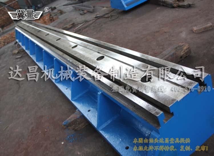 雙槽地軌別稱:雙槽地軌也稱為雙槽地梁、雙槽平臺、雙槽槽鐵。雙槽地軌材質:HT200-300,QT400-600,ZG20-45#。雙槽地軌之間間隙(用木條墊實)5mm;地軌在水平面內不平行度允差:0.10/1000,全長0.5mm。每列雙槽地軌在垂直平面內不平度允差:0.10/1000,全長0.5mm。